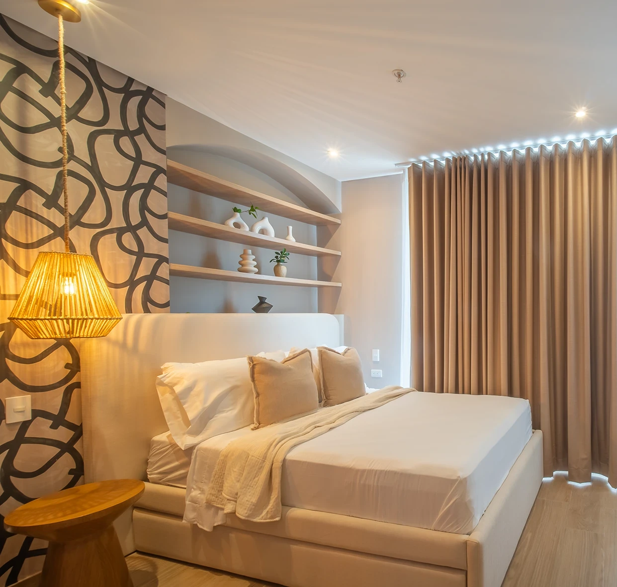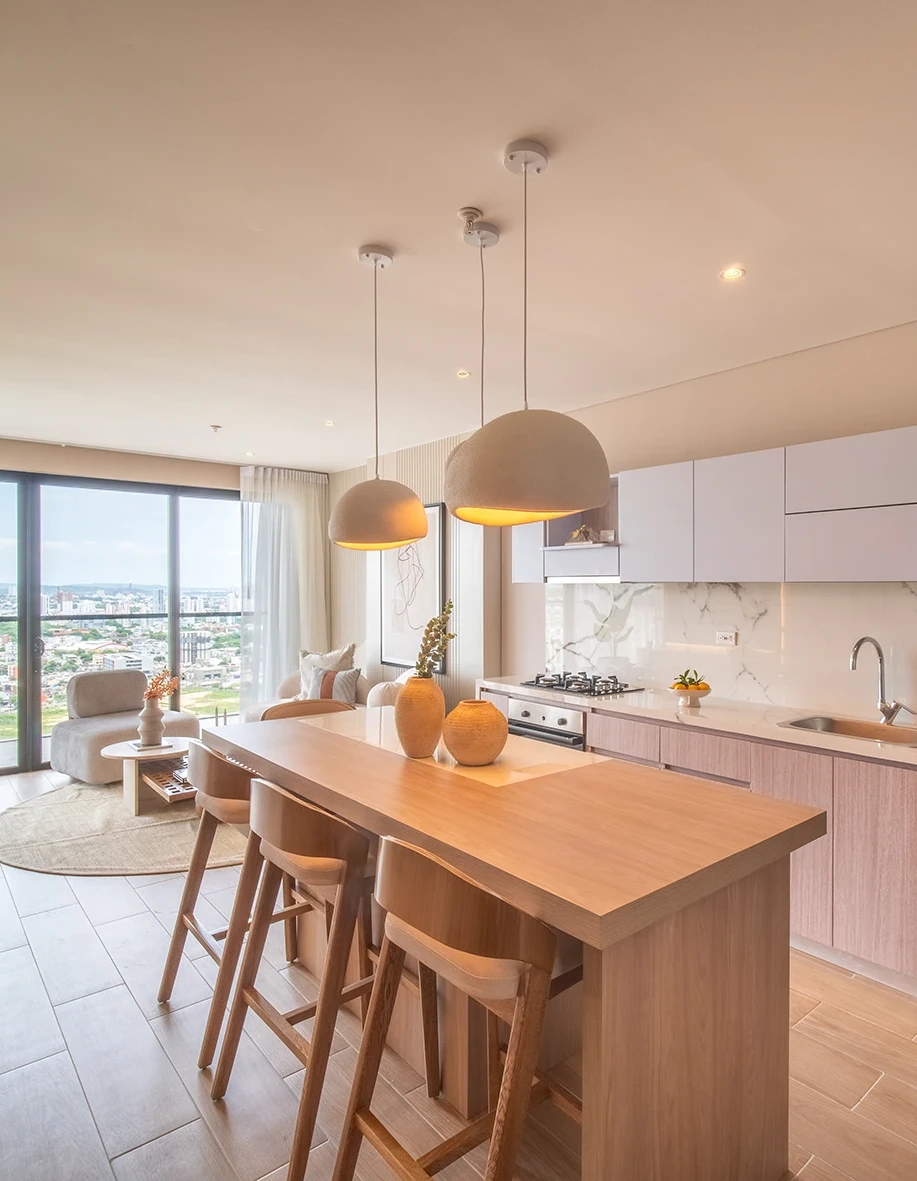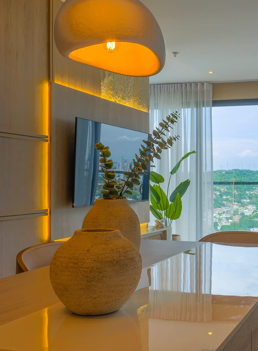 En este espacio se creó una propuesta cálida y luminosa, donde las líneas orgánicas, los tonos neutros y la iluminación estratégica aportan amplitud y equilibrio visual. Cada ambiente fue pensado para sentirse natural, acogedor y funcional en el día a día.