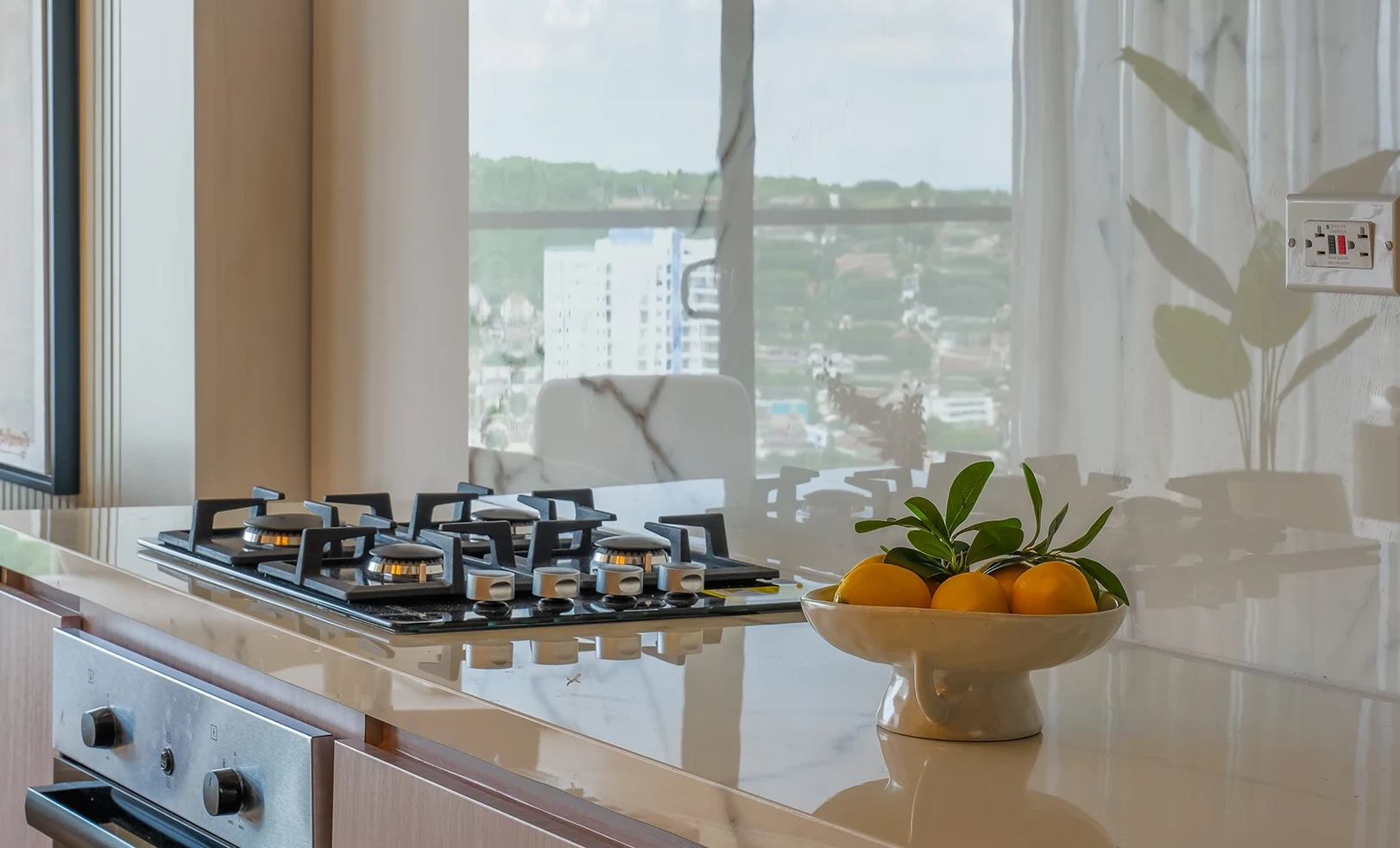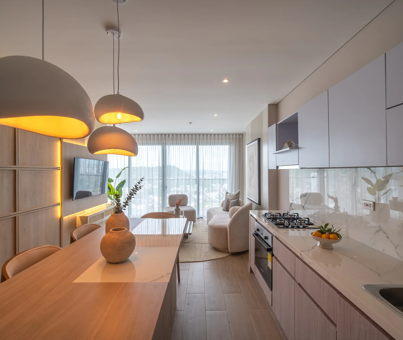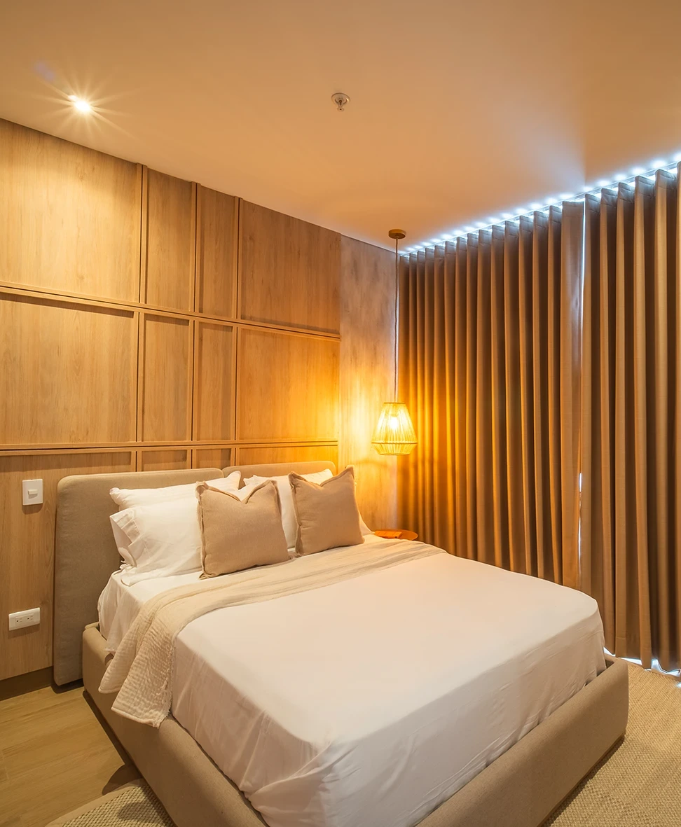 En este espacio se creó una propuesta cálida y luminosa, donde las líneas orgánicas, los tonos neutros y la iluminación estratégica aportan amplitud y equilibrio visual. Cada ambiente fue pensado para sentirse natural, acogedor y funcional en el día a día.